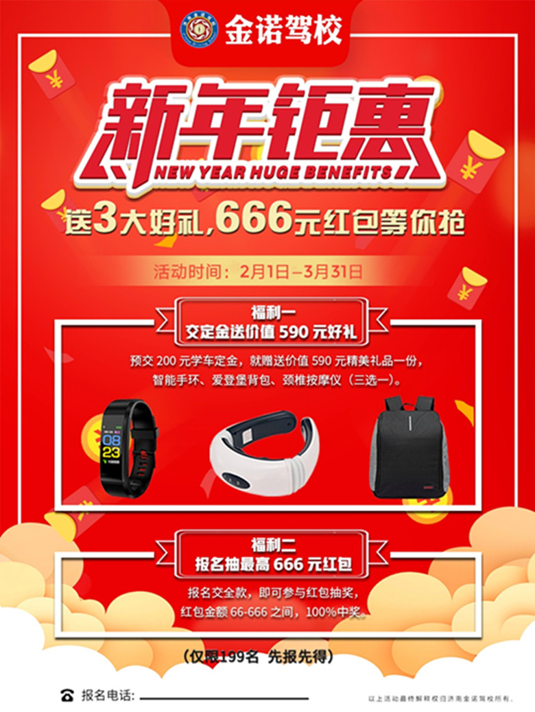 暑期学车,济南金诺驾校泉城钜惠,学车送3大好礼,凡网上预约报名并预交定金200元即可赠送价值590元的精美礼品一份,还有666元紅包等你抢,名额有限,先到先得哦,报名热线:82050111,网上预约报名电话:18678853966(微信同号)