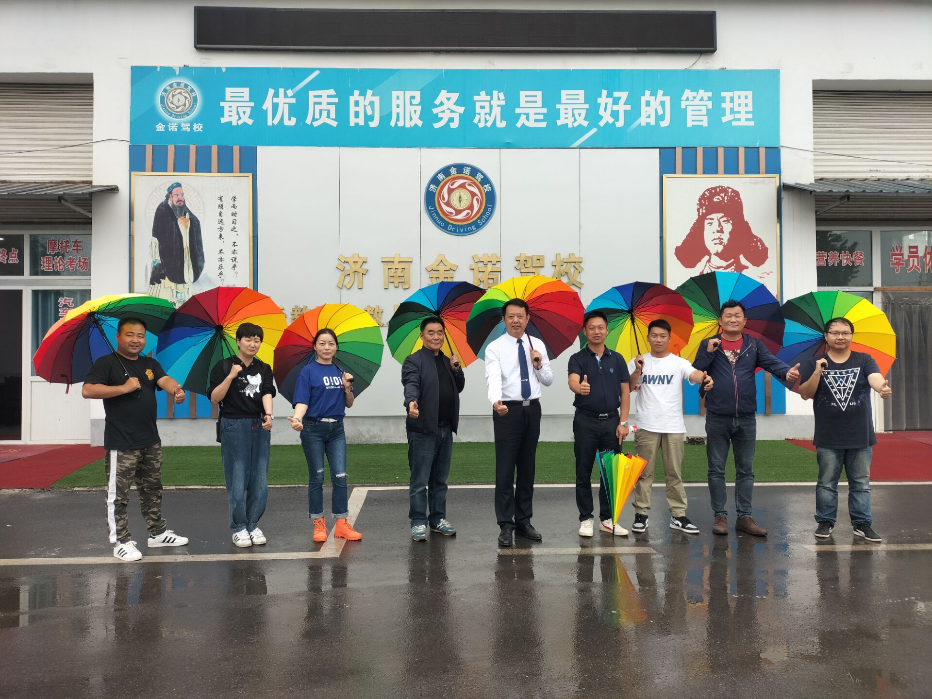 谢云全总经理与驾培同仁在形象墙前合影,富有金诺特色的彩虹伞为合影增添了浪漫的气息~~